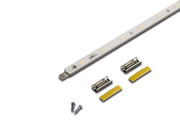 Steckbarer LED-Stab ohne Dunkelzonen im Aluminiumprofil, Lichtfarbe `xw` ca. 2700K, einfache Montage durch beiliegende Clipbefestigung, Anschlussleitung einfach anstecken und bis zu 2,4m die Stäbe zusammenstecken bzw. dann jeweils einen Stick SE (mit seitlicher Einspeisung) für unendliche Lichtbänder verwenden, optionales Zubehör: dimmbarer Trafo mit Funkfernbedienung oder 1-10V Dimmer, Tast-Schalter, Abdeck- und Einfräsprofil zum kompletten Einbau in Holz