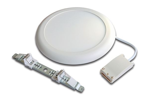 Ein- / Anbaustrahler mit Flächenlicht Gehäuse Kunststoff, inkl. Anschlussklemme für 230V mit integrierter Durchgangsverdrahtung, Lichtfarbe ww (warm weiß) ca. 3000K, schnelle und einfache Montage durch verstellbare Federklemmen für Bohrungen von 65 bis 205mm, dimmbar mit Phasendimmer