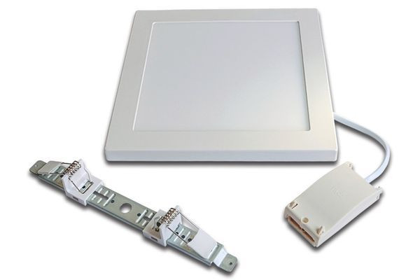Ein- / Anbaustrahler mit Flächenlicht Gehäuse Kunststoff, inkl. Anschlussklemme für 230V mit integrierter Durchgangsverdrahtung, Lichtfarbe xw (extra warm weiß) ca. 2700K, schnelle und einfache Montage durch verstellbare Federklemmen für Bohrungen von 65 bis 205mm, dimmbar mit Phasendimmer