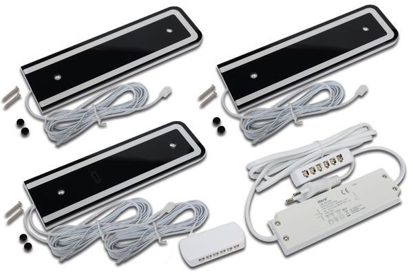 Design LED-Unterbauleuchte mit homogenem Flächenlicht als 3er Set, Gehäuse Metall, Anschlussleitung 2,5m mit LED 24-Stecker, incl. steckerfertigem Trafo, Lichtfarbe warm weiß ca. 3000K, inkl. berührungsloser IR-Dimmer