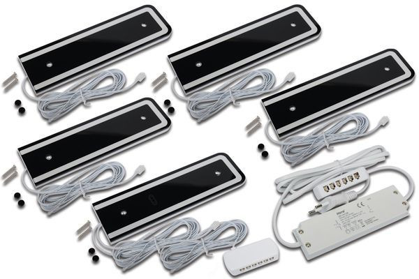 Design LED-Unterbauleuchte mit homogenem Flächenlicht als 5er Set, Gehäuse Metall, Anschlussleitung 2,5m mit LED 24-Stecker, incl. steckerfertigem Trafo, Lichtfarbe neutral weiß ca. 4000K, inkl. berührungsloser IR-Dimmer