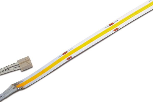 Flexibles LED-Band auf Rolle, Lichtfarbe extra warm weiß ca. 2700K mit Flächenlicht ohne sichtbare LED Punkte, schnelle und einfache Montage durch das bereits aufgebrachte doppelseitige 3M Klebeband, inkl. Anschlussleitung 2,5m mit LED 24-Stecker, das Band kann alle 50mm abgeschnitten werden (siehe Markierung), optionales Zubehör: Dimm-Controller mit Funkfernbedienung, 1-10V, DALI, ZigBee, Sonar oder BLE-Steuerung