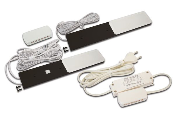 LED-Unterbauleuchte mit homogenem Flächenlicht als 2er Set, Gehäuse Metall, Anschlussleitung 2,5m mit LED 24-Stecker, inkl. steckerfertigem Trafo, Lichtfarbe warm weiß ca. 3000K, inkl. Touch-Dimmer
