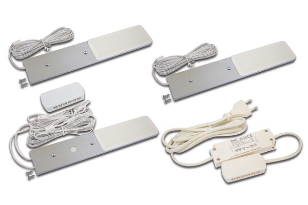 LED-Unterbauleuchte mit homogenem Flächenlicht als 3er Set, Gehäuse Metall, Anschlussleitung 2,5m mit LED 24-Stecker, inkl. steckerfertigem Trafo, Lichtfarbe neutral weiß ca. 4000K, inkl. Touch-Dimmer