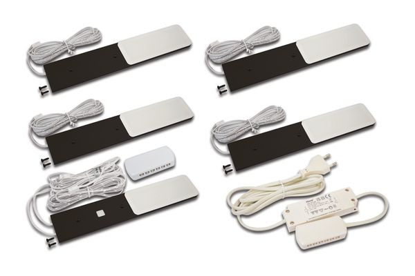 LED-Unterbauleuchte mit homogenem Flächenlicht als 5er Set, Gehäuse Metall, Anschlussleitung 2,5m mit LED 24-Stecker, inkl. steckerfertigem Trafo, Lichtfarbe neutral weiß ca. 4000K, inkl. Touch-Dimmer