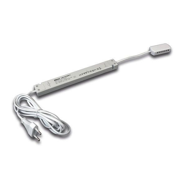 Elektronischer Sicherheitstransformator 24V DC, Netzanschlussleitung 2m mit Eurostecker, 12-fach Verteiler, max. zulässige Länge der Sekundärleitungen 5m, mit 16mm Höhe sehr flache Bauweise