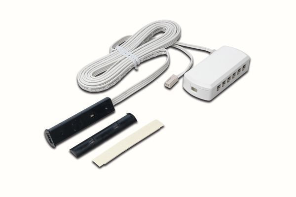 Berührungsloser IR-Schalter zum Anschluss von LED-Leuchten mit 24V, Anschlussleitung 2,5m mit LED 24-Stecker, Schaltleiteitung 2,5m mit 11-fach Verteiler, Zur Montage in 14,5mm Bohrungen oder zum ankleben mit beiliegendem Klebepad, am Schalter kann zwischen folgenden beiden Funktionen gewählt werden: Funktion 1 (Lieferzustand): Lichteinschaltung mit erster Bewegung, -ausschaltung mit folgender, Funktion 2: Beim Öffnen der Tür schaltet sich das Licht ein und beim Schließen der Tür wieder aus, zur Überwachung mehrerer Türen können bis zu 11 Schalter parallel angeschlossen werden