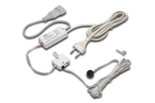 Berührungsloser Türkontakt-Schalter zum Anschluss von Leuchten-Betriebsgeräten der Schutzklasse II, Anschlussleitung 3m mit Eurostecker, Schaltleitung 0,3m mit Eurokupplung, Sensorleitung 3m mit Sensorkopf K59, Schalt-Funktion: Beim Öffnen der Tür schaltet sich das Licht ein und beim Schließen der Tür wieder aus.