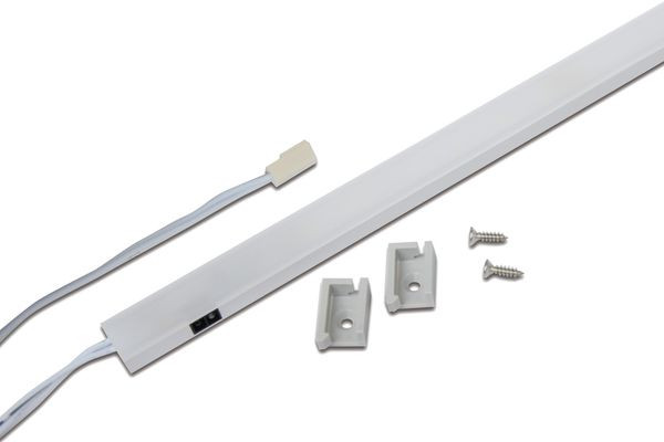 Schrankinnenleuchte mit berührungslosem IR Sensorschalter, Anschlussleitung 2,5m mit LED 24-Stecker, Lichtfarbe neutral weiß ca.4000K, Montageclip zur seitlichen Befestigung bei Auszügen und 500mm selbstklebender Kabelkanal beiliegend