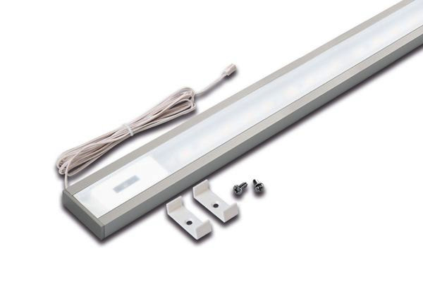 Flache LED-Unterbauleuchte mit homogenem Flächenlicht, Gehäuse Alu, Anschlussleitung 2,5m mit LED 24-Stecker und Leitungsaustritt nach hinten, Lichtfarbe neutral weiß ca.4000K, incl. berührungsloser IR-Schalter mit NightLight Funktion (zusätzliche kleine LED zur Orientierung im Raum am IR-Schalter), incl. 250mm selbstklebendem weißen Kabelkanal wenn die Leuchte mittig über der Küchen-Arbeitsplatte montiert wird und die Leitung unter dem Hängeschrank nach hinten Richtung Nischenrückwand weggeführt werden muss.
