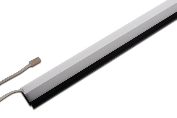 Regalbodenleuchte für 19mm Holzböden, Gehäuse Alu in schwarz eloxiert, Anschlussleitung 2,5m mit LED 24-Stecker, Lichtfarbe warm weiß ca. 3000K