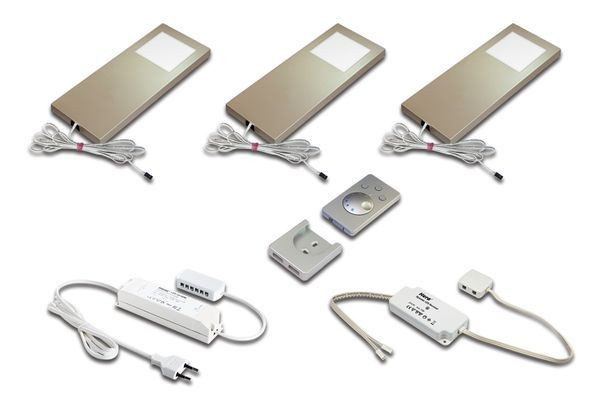 Quadratische, flache LED-Unterbauleuchte mit homogenem Flächenlicht als 3er Set, Anschlussleitung 2,4m mit Dynamic-Stecker, Lichtfarbe einstellbar zwischen ca. 2700K und 5000K, Steuerung über Funk-Fernbedienung