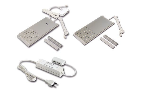 Quadratische, flache LED-Unterbauleuchte als 2er Set, Gehäuse Alu, Anschlussleitung 2,5m mit LED 24-Stecker, incl. steckerfertigem 30W Trafo, Lichtfarbe warm weiß ca.3000K, incl. berührungsloser IR-Schalter mit NightLight Funktion (zusätzliche kleine LED zur Orientierung im Raum am IR-Schalter)
