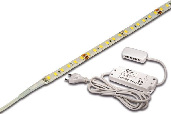 Flexibles LED-Band auf Rolle, Lichtfarbe neutral weiß ca. 4000K, schnelle und einfache Montage durch das bereits aufgebrachte doppelseitige 3M Klebeband, inkl. Anschlussleitung 2,5m mit LED 24-Stecker, das Band kann alle 50mm abgeschnitten werden (siehe Markierung), optionales Zubehör: dimmbarer Trafo mit Funkfernbedienung oder 1-10V Dimmer, Glaskantenprofil zur seitlichen Lichteinspeisung von Glasscheiben, Eckprofil, Montageprofil, Abdeckprofil, Einfräsprofil oder Montageprofile nach Entfernen der Vergussmasse an den Kontaktstellen können die Streifen mit den Clipsen weiter verbunden werden