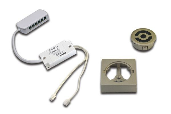 Dimm-Controller 24V DC mit beiliegender Einbau-Funkfernbedienung in edelstahloptik, für Holzbohrung 35mm Durchmesser und min. 12mm tief, mit Memory-Funktion (nach Netztrennung wird der vorherige Dimmzustand wieder hergestellt), inkl. Batterie, Anschlussleitung mit zwei LED 24-Steckern und 12-fach Verteiler für die Leuchten