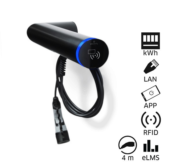 Wallbox, Ausrichtung waagerecht rechts, Ausführung SMART, schwarz matt pulverbeschichtet (RAL 9005), max. Ladeleistung 11kW, max. Ladestrom 16A, MID-konformer Energiezähler, DC-Fehlerstromerkennung, im Innen- und Außenbereich frei positionierbar, Autorisierung über RFID oder Smartphone über eCC App (electrify Charge Control), Plug and Start, LAN und WLAN und digitale Eingänge, Master / Slave via electrify Mesh, Modbus TCP, OCPP Einbindung, kostenloses Backend über eLMS (electrify Lademanagementsystem), 4 Meter Ladekabel (Typ 2), Klimasystem durch Axiallüfter und Heizung, Schutzart IP 54, einfache Montage, incl. 2x RFID-Karte, Wandadapter zur Aufputzinstallation, Befestigungsmaterial, Adapter digitale Eingänge, Gerätepass, Montagekurzanleitung
