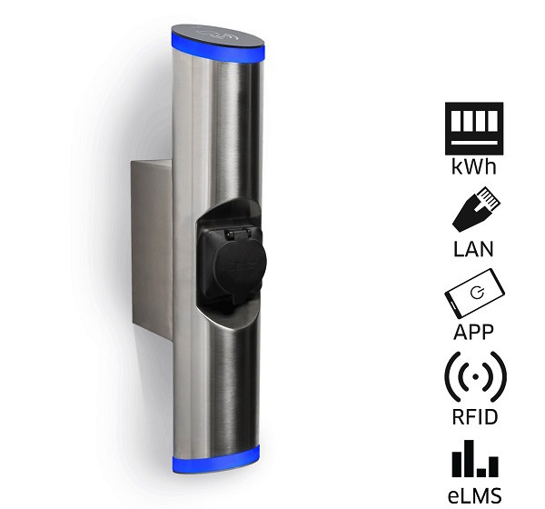 Wallbox, Ausrichtung senkrecht, Ausführung SMART, Edelstahl gebürstet, max. Ladeleistung 22kW, max. Ladestrom 32A, MID-konformer Energiezähler, DC-Fehlerstromerkennung, im Innen- und Außenbereich frei positionierbar, Autorisierung über RFID oder Smartphone über eCC App (electrify Charge Control), Plug and Start, LAN und WLAN und digitale Eingänge, Master / Slave via electrify Mesh, Modbus TCP, OCPP Einbindung, kostenloses Backend über eLMS (electrify Lademanagementsystem), 4 Meter Ladekabel (Typ 2), Klimasystem durch Axiallüfter und Heizung, Schutzart IP 54, einfache Montage, incl. 2x RFID-Karte, Wandadapter zur Aufputzinstallation, Befestigungsmaterial, Adapter digitale Eingänge, Gerätepass, Montagekurzanleitung
