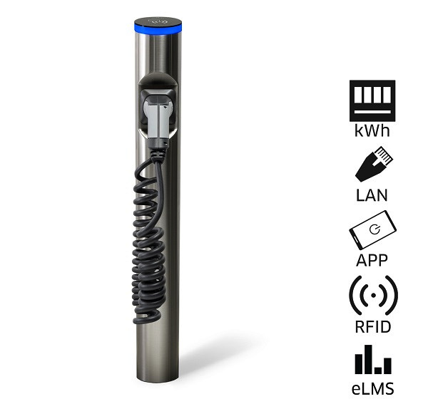 Ladesäule, Ausführung SMART, Edelstahl gebürstet, max. Ladeleistung 22kW, max. Ladestrom 32A, MID-konformer Energiezähler, DC-Fehlerstromerkennung, im Innen- und Außenbereich frei positionierbar, Autorisierung über RFID oder Smartphone über eCC App (electrify Charge Control), Plug and Start, LAN und WLAN und digitale Eingänge, Master / Slave via electrify Mesh, OCPP Einbindung, Modbus TCP, kostenloses Backend über eLMS (electrify Lademanagementsystem), 4 Meter Spiralkabel (Typ 2), Klimasystem durch Axiallüfter und Heizung, Schutzart IP 54, einfache Montage, incl. 2x RFID-Karte, Fundamentgestell, Befestigungsmaterial, Adapter digitale Eingänge, Gerätepass, Montagekurzanleitung
