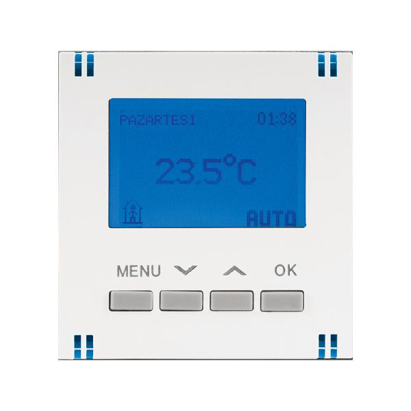 Temperaturregleraufsatz digital, Farbe weiß, Abdeckung für Einsatz 90500490-DE, Steuerungseinheit mit Zentralscheibe 50x50mm, passend für alle gängigen Schalterfabrikate in Verbindung mit Zwischenrahmen, zur Montage auf Thermostateinsatz, mit beleuchtetem Display mit Anzeige von Temperatur, Wochentag, Uhrzeit und Betriebsmodus, Tages- und Wochenprogramm für 3 Betriebsmodi: Standard, Komfort- und Nachtmodus, automatischer Sommer- Winterzeitumstellung, programmierbare Displaybeleuchtung, Spracheinstellung und Frostschutzfunktion +5°C, Temperaturbereich +5°C bis +30°C, Schaltdifferenz 1K, IP20