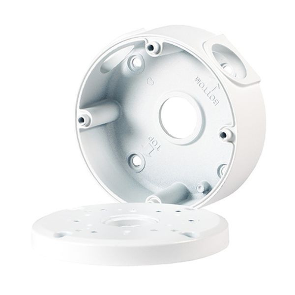 Aufputzkasten aus Metall zur Montage von externen Villa Kameras (C02 und C03), mit mehreren Gummi-Membranen zur Kabeleinführung, diverse Schrauböffnungen zum Befestigen unterschiedlicher Kameras, Farbe weiß pulverbeschichtet