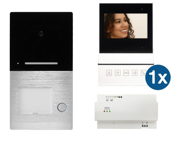 Einfamilien-Set Villa Video 2-Draht Freisprechanlage Aufputz, bestehend aus 1x AS AP Türstation Aufputz mit einer Klingeltaste (Aluminiumgehäuse, man. Lautstärkenregler, Kamera mit 1,0 Megapixel und einem Erfassungsbereich von 110?, Tag-Nachtmodul mit LED-Beleuchtung, 1 Klingeltaster mit Namensschild LED-beleuchtet, Anschlussklemmen für Busleitung, potentialfreier Türöffnerkontakt, Potentiometer Türöffnerzeit, Belastbarkeit potentialfreier Türöffnerkontakt max. 1 A 24 V (DC) / 12 V (AC), LED-Rufanzeige, Anschlussmöglichkeit einer externen Türöffnertaste, Abmessungen 192 x 100 x 22 mm) , 1x Villa M B 4,3? Farbmonitor (Wandhalterung, Freisprechfunktion, Mikrofon, Lautsprecher, Sprech-, Türöffner- und Rufton aus-Taste, für Parallelbetrieb geeignet, Anschlussmöglichkeit eines Etagentasters, Einstellmöglichkeit der Ruflautstärke, unterschiedlicher Klingeltöne sowie Helligkeit und Kontrast, Ruftonunterscheidung Ruf intern, Außenstation oder Etagenruf (fest eingestellt), 4 Monitore parallel je Klingeltaste möglich (ohne weitere Zusatzgeräte), Spannungsversorgung Villa 2-Draht Bus 30V DC, Farbe weiß, Abmessungen: 180 x 120 x 19,5 mm), 1x Villa NG Hutschienennetzteil (für Verteilereinbau, Eingang 230 V, Ausgang 30 V DC für Busleitung, Status ? LED, Abmessungen 144 x 90 x 64 mm / 8 TE)