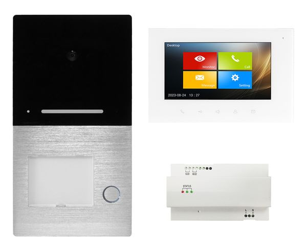 Einfamilien-Set Villa Video 2-Draht Freisprechanlage, bestehend aus 1x AS AP Türstation Aufputz und einer Klingeltaste (Aluminiumgehäuse, man. Lautstärkenregler, Kamera mit 1,0 Megapixel und einem Erfassungsbereich von 110?, Tag-Nachtmodul mit LED-Beleuchtung, 1 Klingeltaster mit Namensschild LED-beleuchtet, Anschlussklemmen für Busleitung, potentialfreier Türöffnerkontakt, Potentiometer Türöffnerzeit, Belastbarkeit potentialfreier Türöffnerkontakt max. 1 A 24 V (DC) / 12 V (AC), LED-Rufanzeige, Anschlussmöglichkeit einer externen Türöffnertaste, Abmessungen 192 x 100 x 22 mm) , 1x Villa M Touch-Screen-7" Farbmonitor (Wandhalterung, Freisprechfunktion, Mikrofon, Lautsprecher, Sprech-, Türöffner- und Intercomtaste, für Parallelbetrieb geeignet, Anschlussmöglichkeit eines Etagentasters, Einstellmöglichkeit der Ruflautstärke, unterschiedlicher Klingeltöne sowie Helligkeit und Kontrast, Rufunterscheidung Ruf Intern, Türstation oder Etagentaster, Bildaufnahme mit automatischem Screenshot, SD-Kartenanschluss 2-32 GB für Videoaufnahmen, 4 Monitore parallel je Klingeltaste möglich Farbe: weiß), 1x Villa NG Hutschienennetzteil (für Verteilereinbau, Eingang 230 V, Ausgang 30 V DC für Busleitung, Status ? LED, Abmessungen 144 x 90 x 64 mm / 8 TE)