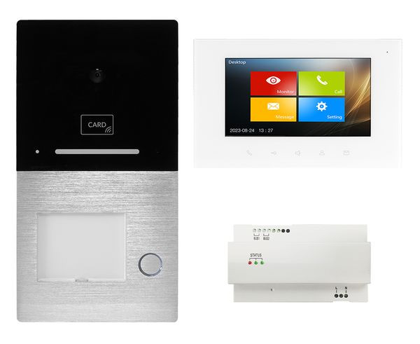 Einfamilien-Set Villa Video 2-Draht Freisprechanlage, mit Zutrittskontrolle per RFID-Kartenleser und/oder mit integrierter Bluetooth-Schnittstelle über eine APP Steuerung für das Smartphone, inkl. Zutrittsverwaltung und Protokollierung, bestehend aus 1x AS AP RL Türstation Aufputz und einer Klingeltaste (Aluminiumgehäuse, man. Lautstärkenregler, Kamera mit 1,0 Megapixel und einem Erfassungsbereich von 110?, Tag-Nachtmodul mit LED-Beleuchtung, 1 Klingeltaster mit Namensschild LED-beleuchtet, Anschlussklemmen für Busleitung, potentialfreier Türöffnerkontakt, Potentiometer Türöffnerzeit, Belastbarkeit potentialfreier Türöffnerkontakt max. 1 A 24 V (DC) / 12 V (AC), LED-Rufanzeige, Anschlussmöglichkeit einer externen Türöffnertaste, Abmessungen 192 x 100 x 22 mm) , 1x Villa M Touch-Screen-7" Farbmonitor (Wandhalterung, Freisprechfunktion, Mikrofon, Lautsprecher, Sprech-, Türöffner- und Intercomtaste, für Parallelbetrieb geeignet, Anschlussmöglichkeit eines Etagentasters, Einstellmöglichkeit der Ruflautstärke, unterschiedlicher Klingeltöne sowie Helligkeit und Kontrast, Rufunterscheidung Ruf Intern, Türstation oder Etagentaster, Bildaufnahme mit automatischem Screenshot, SD-Kartenanschluss 2-32 GB für Videoaufnahmen, 4 Monitore parallel je Klingeltaste möglich Farbe: weiß), 1x Villa NG Hutschienennetzteil (für Verteilereinbau, Eingang 230 V, Ausgang 30 V DC für Busleitung, Status ? LED, Abmessungen 144 x 90 x 64 mm / 8 TE)