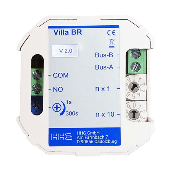 Multifunktions-Busrelais Ausgang für das Villa 2-Draht System, einstellbar per Adressierung entweder zur Ansteuerung durch Klingeltasten (z.B. für externe Läutwerke) oder zur Ansteuerung durch die Türöffnertaste oder Funktionstaste am Monitor (z.B. für Licht an), potentialfreier Ausgangs-Kontakt, Belastbarkeit 30 V DC / 3 A oder 250 V AC / 0,5 A, Zeitverzögerung: 1 - 300 Sek., Abmessungen: 49 x 51 x 22 mm, Schutzart IP 20