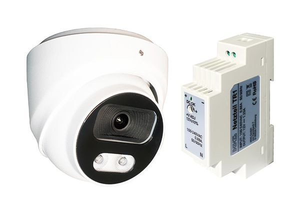 Kamera-Set für Einbaulautsprecher Villa EL, bestehend aus externer Domkamera, Netzteil und Anschlußkabel, externe Farb-Domkamera im robustem Gehäuse, mit schwenk- und neigbarem Kugelkopf, mit einer integrierten automatischen Tag-/Nachtumschaltung (Nachtmodus: schwarz/weiß mit IR-LEDs), Hutschienen-Schaltnetzteil 230V AC Eingang, 12V DC, 1A Ausgang, zur Montage auf DIN-Hutschiene 2 TE