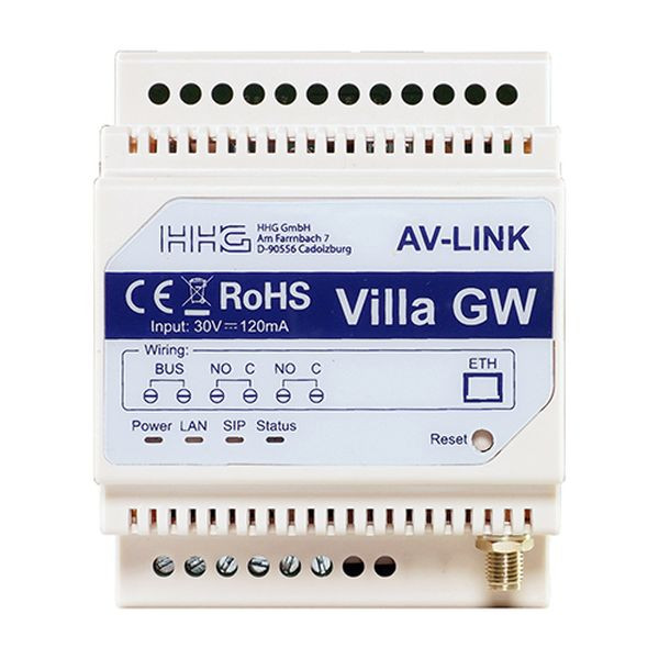 Smarthome-WLAN-Gateway zur Verbindung von Villa Videoanlagen mit der iLifestyle App, Reiheneinbaugerät mit 4 Teilungseinheiten, inkl. WLAN-Antenne, Villa-Busanschluss, RJ45-Port, 2 integrierte potentialfreie Relais, LED-Statusanzeigen, über die iLifestyle App lässt sich das Gateway in ein lokales WLAN (2,4 GH z) Netzwerk einbinden, dies erlaubt die Annahme von Gesprächen (Audio- und Videoübertragung) verbundener Villa Videosprechanlagen über die App, ebenso ist ein Bildhol-Modus integriert, die beiden integrierten potentialfreien Relais können z.B. für eine Lichtschaltung direkt aus der App aktiviert werden