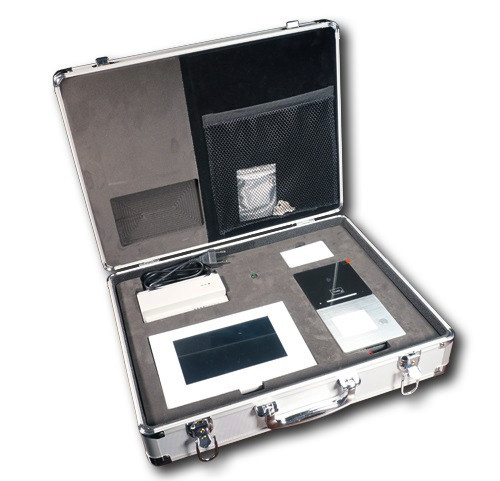 Musterkoffer VILLA MK AP RL, bestückt mit 1x Monitor Villa M, 1x Türstation Villa AP 1 AS RL mit Bluetooth und RFID-Funktion, 1x Netzgerät Villa NG, fertig verdrahtet und voll funktionsfähig (inkl. LED-Anzeige für Türöffnerkontakt), mit Schutzkontakt-Stecker-Verbindung