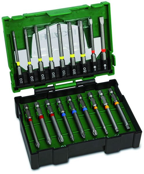 18-teilige Bit-Box Inhalt (Sonderlänge 75 mm) innensechsrund mit Bohrung: 1x T10, 1x T15, 1x T20, 1x T25, 1x T27, 1x T30, 1x T40 Pozidriv: 1x No.1, 1x No.2, 1x No.3 Phillips: 1x No.1, 1x No.2, 1x No.3 Schlitz: 1x 4, 1x 6 mm Hexagon: 1x 3, 1x 4, 1x 5 mm