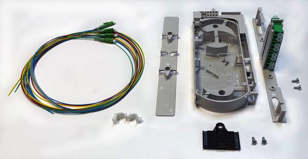 Aufrüstkit für Wandspleißbox homePOP Basic, bestehend aus Spleißkassetten, Adaptern und Halterungen, Pigtails, Ordnungssysteme und Zubehör in Anlehnung an EN50700 für bis zu 12WE