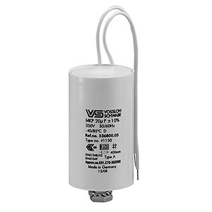 Parallel-Kondensatoren mit Anschlussleitungen 250 V, 50/60 Hz Kondensatoren Typ A Gehäuse: Kunststoff, weiß Befestigung: Gewindebolzen M8x10 mit beigelegter Mutter und Zahnscheibe Entladewiderstand Leitungen: H05V2U 0,5 qmm Länge: 250 mm