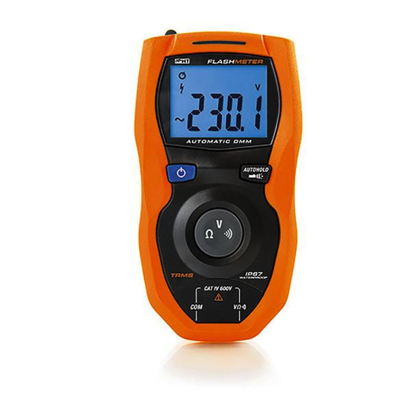 Das FLASHMETER ist ein kompaktes Digitalmultimeter, das in der Lage ist TRMS-Spannungsmessungen bis zu 600 V sowie Widerstandsmessungen automatisch durchzuführen, indem einfach die Eingangsklemmen eingesetzt werden. Es wurde gemäß der Sicherheitsnorm IEC/EN61010-1 mit doppeltem Isolationsschutz in 600 V CAT IV entwickelt. Das FLASHMETER verfügt über eine weiß leuchtende Taschenlampe, einen Sensor zur berührungslosen Erkennung von Wechselspannung und ist nach IP67 wasserdicht.