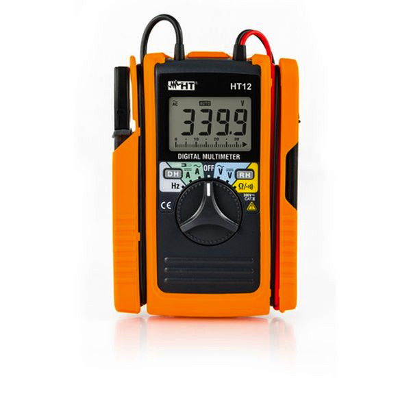 Das innovative Multimeter HT12 wurde entwickelt, um neben den üblichen Messaufgaben auch Gleich- & Wechselströme bis zu 60 A ohne Auftrennen des zu überprüfenden Leiters sicher und genau zu messen. Das mit einer Gabelstromzange ausgestattete Multimeter verfügt über eine große, 3400 Punkte auflösende, Anzeige mit Bargraph und eine Auto Power OFF Funktion um die Batterien zu schonen. Das HT12 bietet sich auch aufgrund seiner geringen Abmessungen bestens für eine Vielzahl von Messfunktionen mit an.