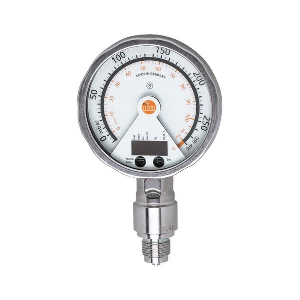 Elektronischer Drucksensor mit analoger Anzeige; -0,0125...0,25 bar; -12,5...250 mbar; -5...100,4 inh2o; G 1/2 Außengewinde; Schaltsignal; Analogsignal; 4...20, invertierbar; (skalierbar) mA; Steckverbindung; -25...80 °C; IP 67; IP 69K; Relativdruck