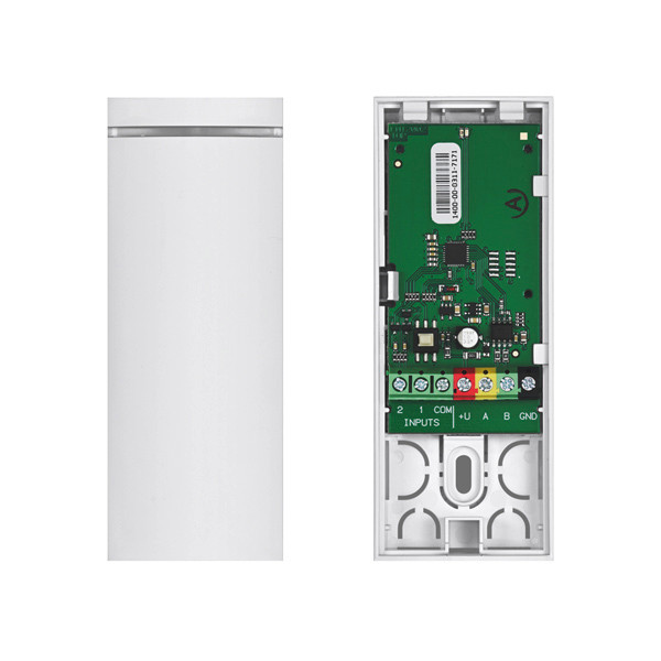 Bus-Eingangsmodul zur Anbindung von zwei verdrahteten Öffnungsmeldern (NC/NO einstellbar) bzw. 2 Meldelinien (max. Länge 100m und mit bis zu 5 Magnetkontakten, wahlweise über Einzel- oder Doppelwiderstandsüberwachung ) an den Bus des System 9000. Aktivierungsdauer des Eingangs: 0,1 - 300s einstellbar. Belegt zwei Adressen im System. Spannungsversorgung über Bus. Ruhestromaufnahme: 7mA, I-calc =12mA. Abmessungen: 44 x 110 x 26mm.