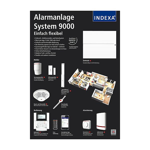 Mustertafel Alarmanlage System 9000. Mit funktionsfähigen Komponenten: Funk-Alarmzentrale 9000ZF, Bus-Bedienteil 9000TD, Funk-Öffnungsmelder 9000MX, Funk-Öffnungsmelder 9001ME, RFID-Chip 9000TAG6, Fernbedienung 9000R4, Notstromakku HP13. Mit Leergehäusen des Rauchmelders 9000S und des Bewegungsmelders 9000P. USB-Kabel beigepackt, N-Link-Software nach Registrierung bei Indexa erhältlich. Abmessungen: 700 x 1000mm.