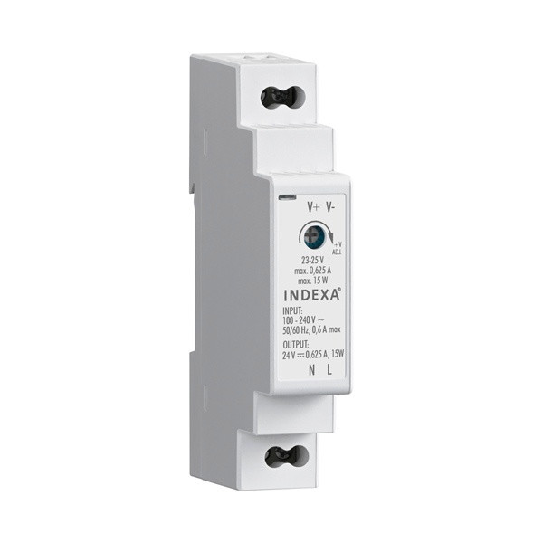 Hutschienen-Netzteil 24V DC / 0,625A Netzgerät für die Gebäudetechnik, Schaltnetzteil 24V DC, max. 0,625A, 15W, zur Montage auf 35mm DIN-Normschienen (TS35, 1TE). Eingang: 100 - 240V AC, Ausgang: 23-25V DC einstellbar. LED-Statusanzeige. Abmessungen: 18 x 90 x 59mm.