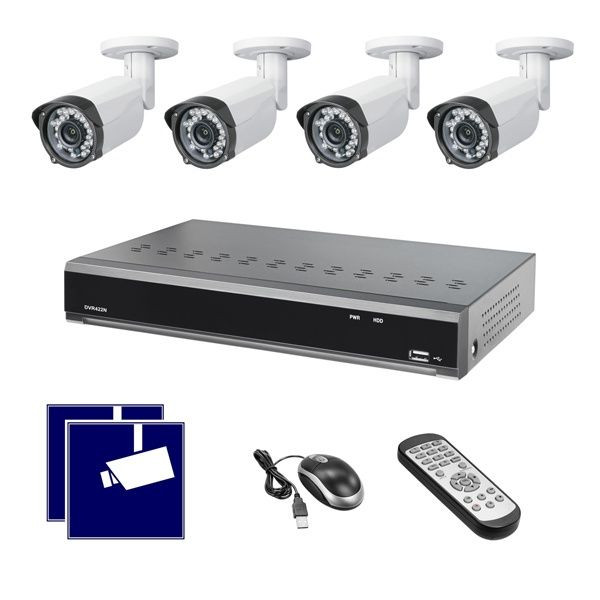 DVR-Set bestehend aus digitalem 4-Kanal Videorecorder DVR422N (AHD 2MP Aufnahme von bis zu 15 Bildern/s pro Kanal) inkl. 1TB Festplatte, USB-Maus, Infrarot-Fernbedienung, Netzgerät und Netzwerk-Software, 4 St. Full HD Tag/Nacht-Kamera IND2410 (AHD 2MP, zur Innen- oder Außenmontage, IP66) inkl. 3,6mm Fix-Objektiv (horizontaler Erfassungswinkel 84°) und 24 Infrarot-LEDs (Nachtsicht bis 15m) sowie zwei Warnaufklebern >Videoüberwachung< (Piktogramm). App für iOS (App Store) und Android (Play Store, Google-Version) kostenlos erhältlich (nicht Teil des Produkts, keine Zusage eines Servicelevels). Passendes Anschlusspaket VAP02, VAP03 oder VAP01 als Zubehör erhältlich.