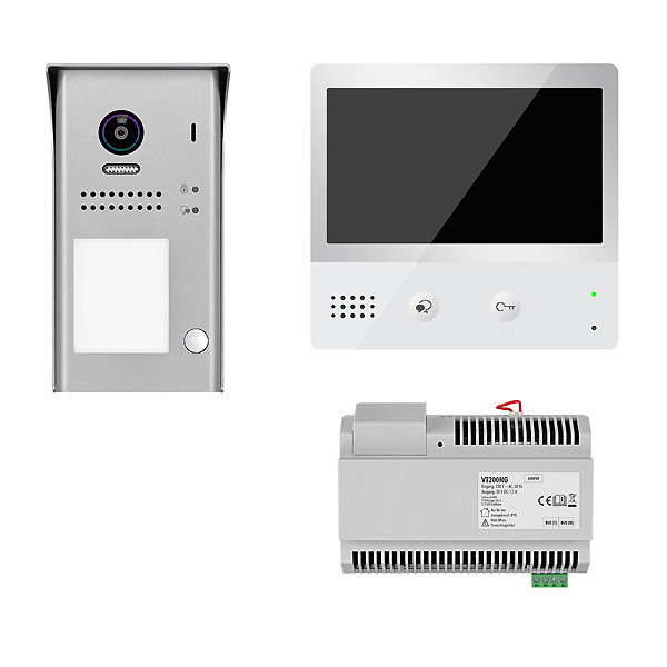 Video-Türsprechanlagen-Set Einfamilienhaus: Türsprechstelle VT200TA1 zur Aufputzmontage, mit einer Ruftaste, in robustem Gehäuse aus ZAMAK-Legierung (IP44, Schlagfestigkeit IK08). Mit Super-Weitwinkel-Farbkamera (170° horizontale Erfassung) mit Zoomfunktion, Weißlicht-LED-Ausleuchtung (bis ca. 0,8m) und beleuchtetem Namensschild. Integrierte RFID-Leseeinheit zur Ansteuerung des Türöffners. Anschluss für Türöffner (ET100A bzw. 12V DC, max. 250mA über Busversorgung oder über integriertes potentialfreies Relais (24V AC/DC, max. 1A). Video-Innenstation VT200MB2 mit 7 Zoll Touch-Bildschirm (sichtbare Bilddiagonale 17,6cm), Freisprechfunktion, 9 auswählbaren Klingeltönen, Kamerazoomfunktion sowie Anschluss für Etagenruftaster, Zusatzsummer oder Funkklingelerweiterung. Verpolungssicherer 2-Draht-Bus-Anschluss an das mitgelieferte VT200 Systemnetzgerät. Lieferung inkl. Transponder-Chip VT200TAG1 im Schlüsselanhänger-Format sowie zwei Verwaltungs-Transponder. Abmessungen Türsprechstelle: 90 x 176 x 26mm, mit Wetterschutzgehäuse: 95 x 180 x 40mm. Abmessungen Innenstation: 185 x 160 x 18mm. Passendes Zubehör: weitere Türsprechstellen, Innenstationen VT200MB2, Transponder-Chips, elektrischer Türöffner ET100A, Tischhalterung VT200SM2, Relaismodul VT200R (zur Ansteuerung eines Türöffners, der die genannten Spezifikationen nicht erfüllt, für manipulationssicheren oder zweiten Türöffner), IP-Gateway VT200IPG (für Bildspeicher, Anschluss von kompatiblen Zusatzkameras, Rufweiterleitung mit Bild-Darstellung auf Smartphone-App über Router).