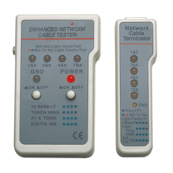 Multifunktions-Kabeltester, RJ-45/RJ-11 Zum Testen von RJ-11 und RJ-45, Kabeltypen: UTP/STP/FTP, LEDs zeigen Verbindungen und Defekte an, testet geschirmte und ungeschirmte Netzwerkkabel, LEDs für Fehleranzeige