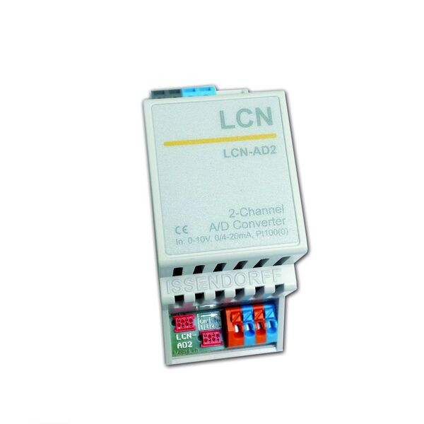 Der LCN-AD2 ist ein doppelter Analog-Digital Wandler mit 12Bit Auflösung für den I-Anschluss. Die Messwerte werden im Modul in die Variablen R1- und R2 eingetragen. Sie wirken wahlweise auf die Schwellwerte oder die Regler. Einsetzbar für alle LCN-Module ab Version 120C05. Der LCN-AD1 wird zur Erfassung von Signalen eingesetzt, für die es keine speziellen LCN-Sensoren gibt. Beispiele sind Sensoren für sehr hohe Temperaturen, Hygrometer, usw. Der LCN-AD2 kann universell eingesetzt werden, da seine Eingänge per DIP-Schalter jeweils einstellbar sind auf: Spannung: 0-10V Strom: 0(4)-20mA Temperatur: Pt100/Pt1000 (Platin-Temp.-Sensoren)