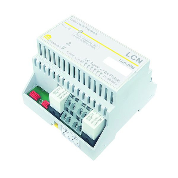 Ein Sechsfach-Relaisbaustein des LCN-Bussystems, der kein separates LCN-Busmodul benötigt. Mit seinen Relais lassen sich beliebige Verbraucher schalten. Der LCN-SR6 lässt sich bei Bedarf mit einem LCN-R2H auf acht Relais erweitern. Dank eines Tasters auf der Oberseite können die Relais von Hand geschaltet werden. Dazu braucht das Modul nicht parametriert zu sein. So kann die Verdrahtung auf der Baustelle geprüft werden, bevor die LCN Anlage eingerichtet wird.