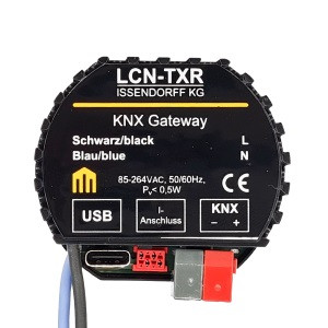 Der LCN-TXR kann gleichzeitig bis zu zwei KNX Taster auf LCN umsetzen. Er unterstützt nicht nur die Tasten selbst, sondern auch die Anzeige-LEDs, Messwerte und Displays. Dabei kann - wie bei LCN üblich - jede einzelne Taste mit drei Kommandos belegt werden (Kurz, Lang und Los). Das Modul verfügt über einen I-Anschluss für ein LCN Bus-Modul, z.B. LCN-UPP, LCN-UPS, usw.