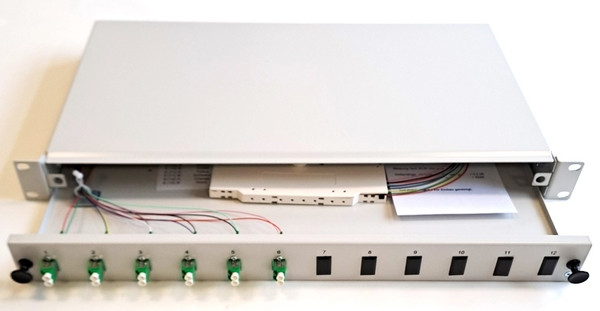 Spleißbox 19" 1HE für 6 x LC -D APC, ausziehbar (Schublade), tiefenverstellbar, RAL7035, inkl. 6 Stück Kupplungen LC/LC-D SM APC grün, 1 x Spleißkassette mit Zugentlastung, Spleißhalter, Deckel, 1 x Verschraubung PG16, Pigtails E9/125µ OS2, LC APC 8°, farbig, 2m, abgesetzt und aufgelegt