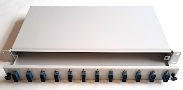 Spleißbox 19" 1HE für 12 x SC-D, ausziehbar (Schublade), tiefenverstellbar, RAL7035, inkl. 12 Stück Kupplungen SC/SC-D SM blau
