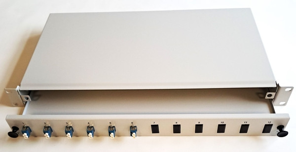 Spleißbox 19" 1HE für 12 x LC-D, ausziehbar (Schublade), tiefenverstellbar, RAL7035, inkl. 6 Stück Kupplungen LC/LC-D SM blau, 6 Stück Blindstopfen