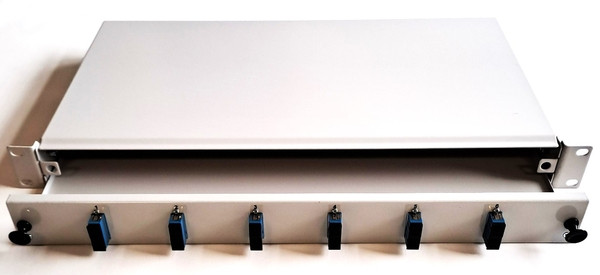 Spleißbox 19" 1HE für 6 x SC-D, ausziehbar (Schublade), tiefenverstellbar, RAL7035, inkl. 6 Stück Kupplungen SC/SC-D SM blau